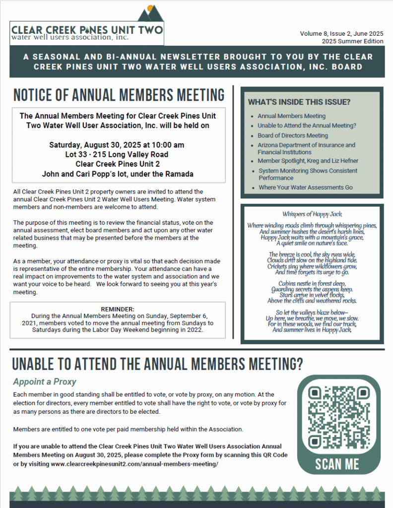 Seasonal and bi-annual newsletters brought to you by the Clear Creek Pines Unit Two Water Wells Users Association, Inc. Board